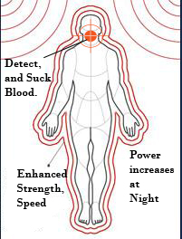 Able to mimic some vampire abilities including enhanced agile, strength, grow fangs, suck and detect people from the blood scent. The ability also able to increases it's power during night time.