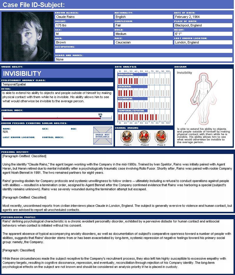The Company keeps files on many of the evolved humans they encounter. With the proper clearance, this information can be obtained by accessing their online system. This is a reproduction of that information.
